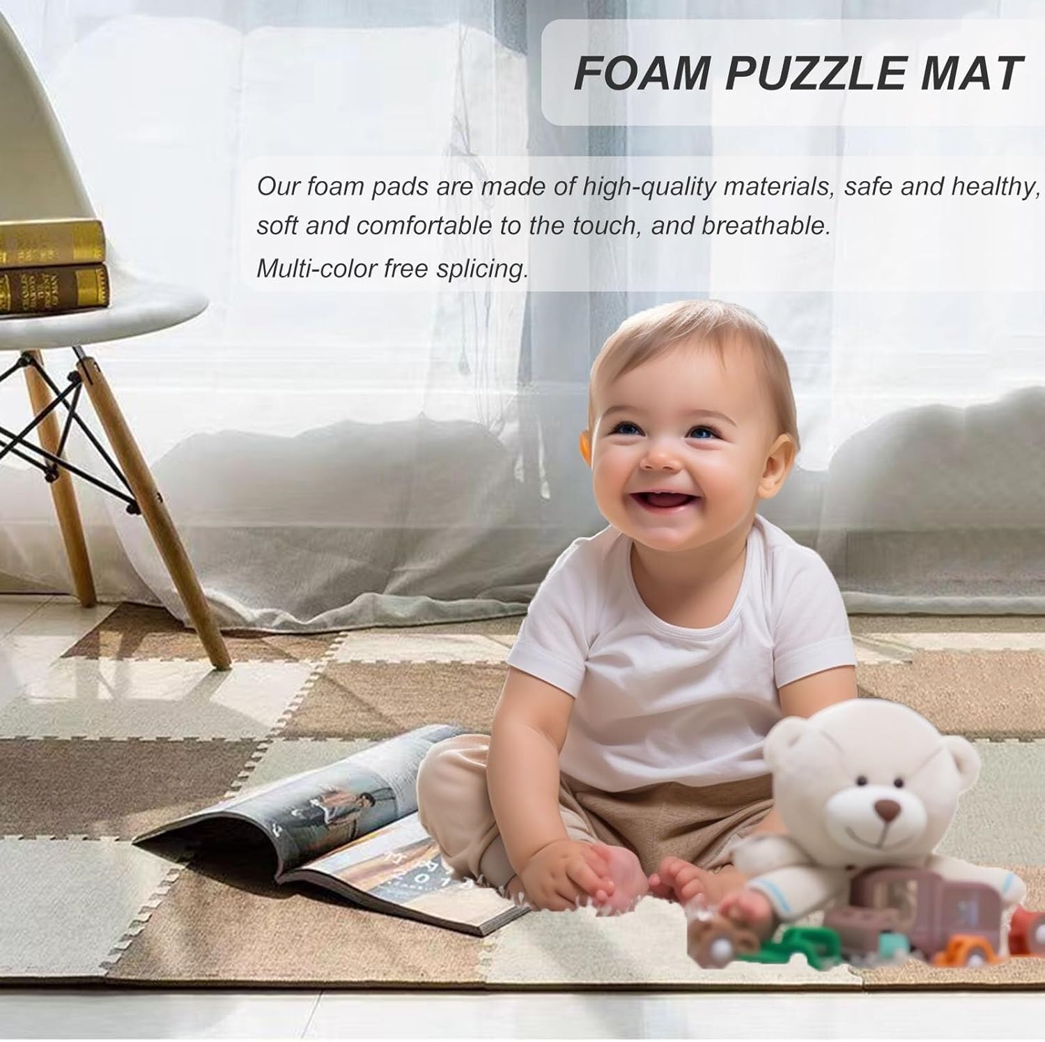 Square Soft Fluffy Tiles with Border Play Mat Protective Floor for Children Kids Room Home Parlor BedroomThis floor puzzle mat is not only suitable for sports venues such as gyms and yoga rooms, but also for game areas, commercial display areas, family activity areas and other scenes. Whether it is sports, leisure or decoration, it can meet your needs.Parameters:Name: Interlocking Foam Floor MatMaterial: Cotton and Linen + High-density FoamSize: 30x30cm (12x12inch)Thickness: 0.6cm/1cm (0.24inch/0.4inch)Shape: SquareQuantity: 100pcsFeatures:Cotton and linen material is highly breathable and easy to cleanBottom texture design enhances stabilityInterlocking puzzle design, flexible splicing, easy to disassemble and store