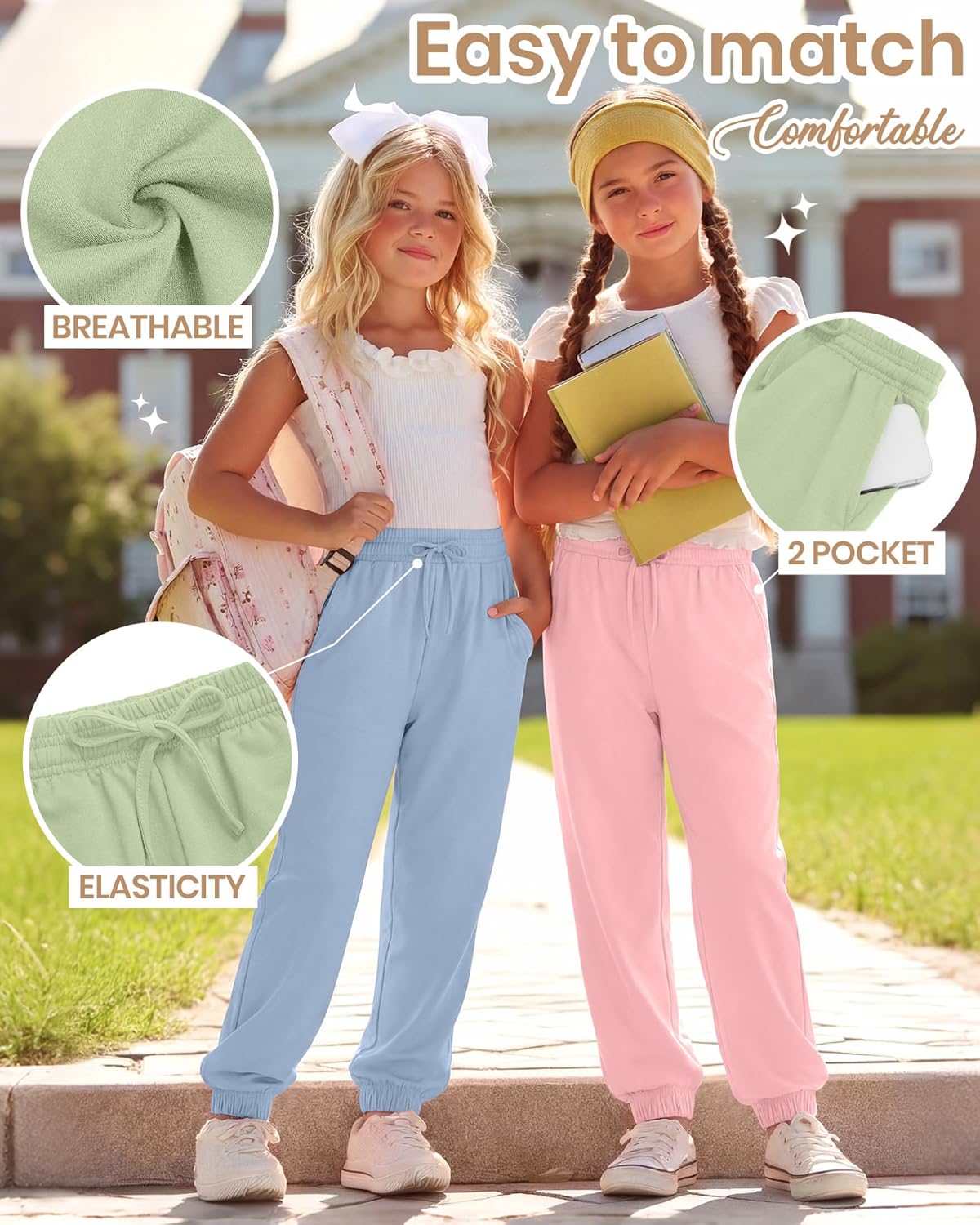 Features: This sweatpants for teen girls are a thoughtful gift for your child or a friend's child, whether for a birthday, holiday, or reward. Our comfy pants for girls are easy to care for, you can throw them in the washing machine or hand wash them, and hang them to dry naturally. Specifications: Material: 80% Polyester, 15% Cotton, 5% Spandex Package includes: 3 x Girls' sweatpants Notes: Manual measurement, please allow slight errors in size. The color may have a slight difference due to different screen displays