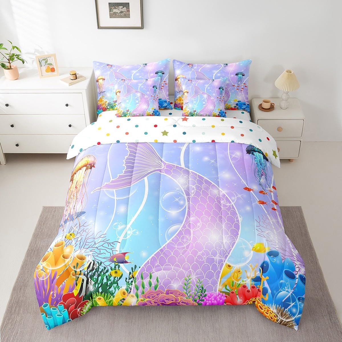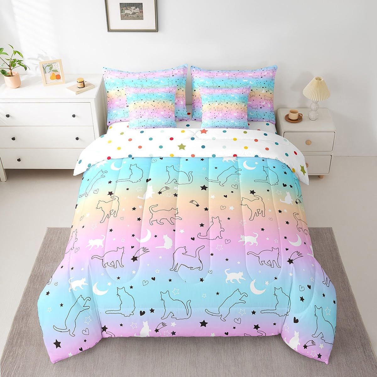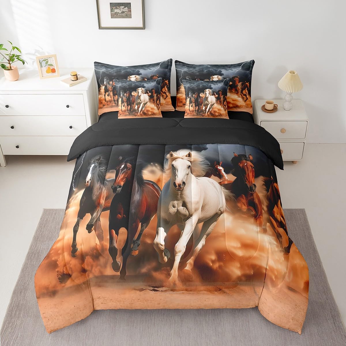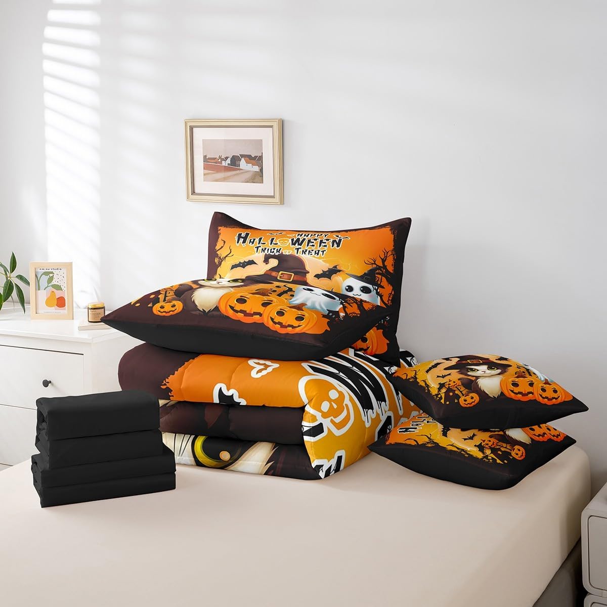 Suitable for various scenarios: Just change the comforter and sheet sets to update your any themed bedroom decor! Can be used for bedroom, guest room, RV,vacation home,dormitory,hotels,camping,etc. Present Idea: Great present idea for your mom, dad, sister, brother, grandma, wife, husband, daughter, son and all other beloved. Size Information: 7 Pieces Twin Size: 1 comforter 68"W x 90"L and 1 Fitted Sheet 39"W x 75"L x 16"H and 1 Flat Sheet 96"W x 66"L and 2 Pillowcase 20"x30" and 2 Cushion Cover 18"x18" 7 Pieces Full Size: 1 comforter 79"W x 90"L and 1 Fitted Sheet 54"W x 75"L x 16"H and 1 Flat Sheet 81"W x 96"L and 2 Pillowcases 20"x30" and 2 Cushion Cover 18"x18" 7 Pieces Queen Size: 1 comforter 90"W x 90"L and 1 Fitted Sheet 60"W x 80"L x 16"H and 1 Flat Sheet 90"W x 102"L and 2 Pillowcases 20"x30" and 2 Cushion Cover 18"x18" 7 Pieces King Size: 1 comforter 104"W x 90"L and 1 Fitted Sheet 79"W x 80"L x 16"H and 1 Flat Sheet 106"W x 90"L and 2 Pillowcases 20"x36" and 2 Cushion Cover 18"x18" Benefits: Use latest 3D printing technology with clear patterns and bright colors, not fade. Made of 100% high strength washed soft polyester microfiber, which is more comfortable and breathable, skin-friendly, feeling smooth, lightweight. Light and warm enough, easy to carry and can be used for going out or traveling. Suitable for all seasons. Easy to care and machine washable,wash with cold water, low roll over and dry, do not bleach. These unique designs match well with various color palettes of your rugs, curtains, headboard, furniture, and all other decor accessories.
