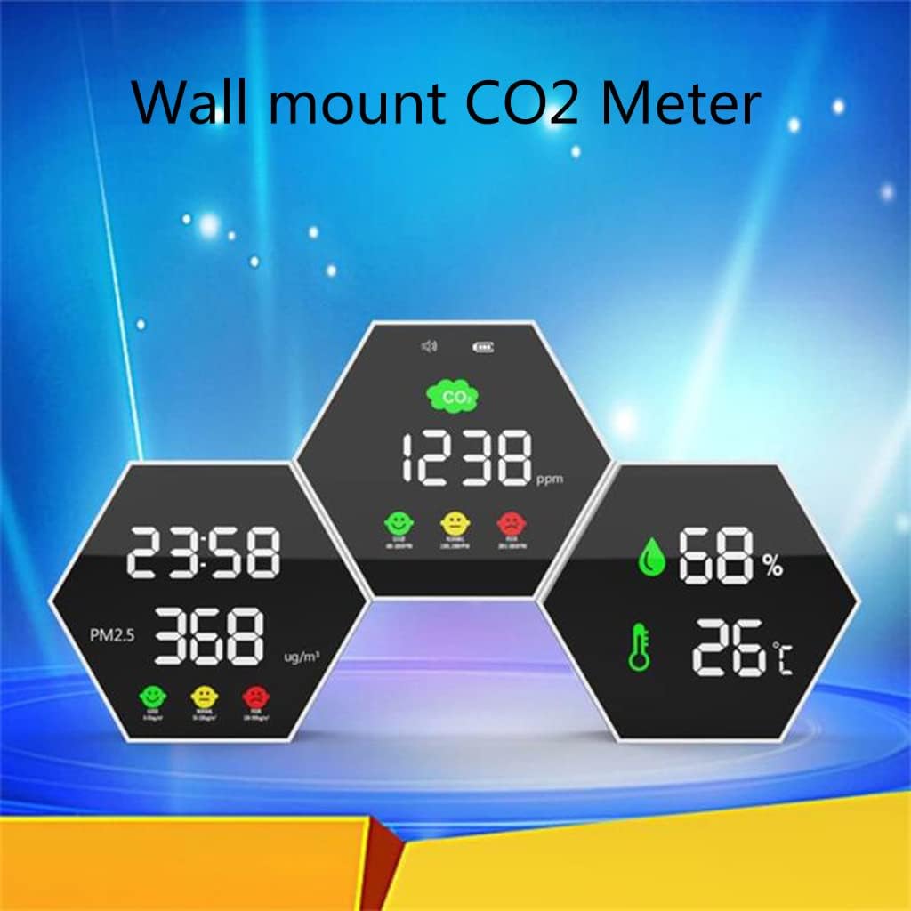 CO2 Detector Meter For W/ Alarm Air PM2.5 CO2 Temp & Humidity Air Detector Features This air with unique hexagon can be used & office.Wall-mounted CO2 Meter with LED large display, easy to watch in a distance.When the arbon dioxide concentration exceeds it will automatically remind of the alarm.Automatically detect OC2, pm2.5, temperature, humidity, with for time display.Detection PM2.5 (0-999 CO2 ( 400-5000 ppm).Can be used in homes, offices, schools, hotels, camping, parties, Specifications ABS+MetalSize: 12x6.1cm/4.72x2.4inInstallation: Wall-mountedCO2 Technology : ( NDIR)PM2.5 technolology : La-ser ScatteringTemperature unit between and 24 hours real for time Detection PM2.5 (0-999 CO2 ( 400-5000 ppm)CO2 Alarm value : 1000ppm default ,but ,800ppm-2000ppm ,but this value can be set by users.CO2 Alarm on /off functionPower supply:rechargable Li-battery 2000mahPackage Includes:1x Air Note Please allow 1-3cm error due to manual measurement. pls make sure you do not mind before you bid.Due to the difference between different monitors, the picture may not reflect the actual color of the item.