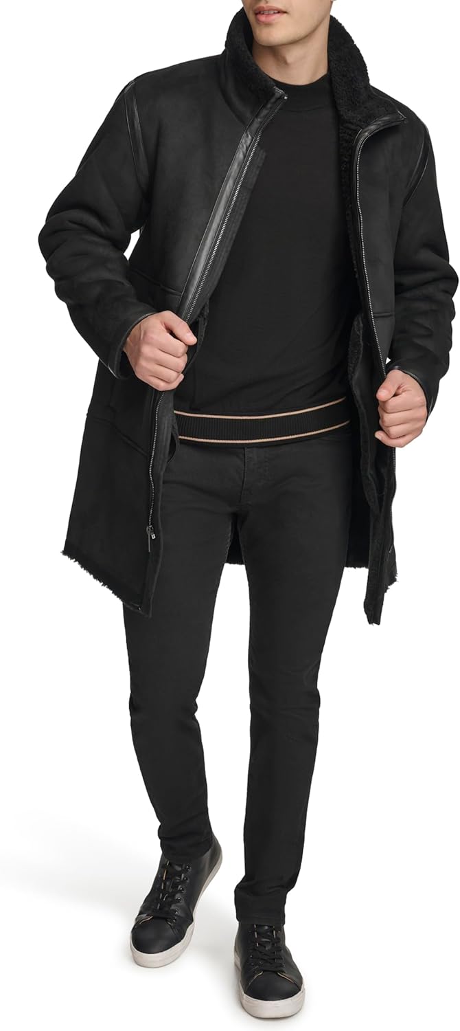 FUNCTIONALITY: Center front zipper closure with vent slit at hem. FEATURES: Faux leather trim on zipper tape and seams, cozy stand collar. VERSATILIY: Faux shearling walking coat can be worn for casual or dressy occasions.