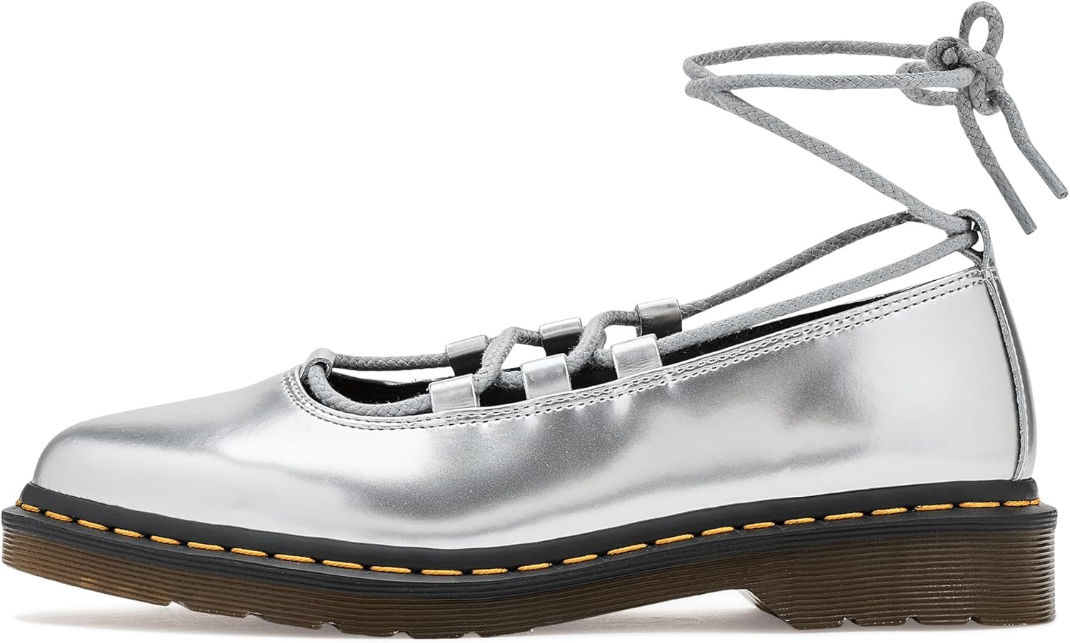 The Dr. Martens Elphie II Lace-Up shoe takes the ballet flat and gives it a bold twist, fewer frills, more Doc’s. Updated in silver metallic patent Lamper leather, it catches all the attention wherever you go. The pointed silhouette is anchored on a tapered sole with DM’s signature grooving and yellow welt stitching, while wraparound laces let you personalise your look.