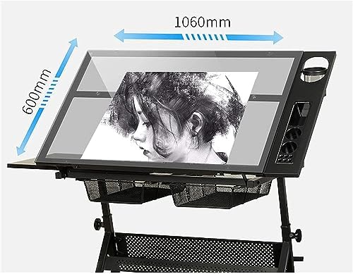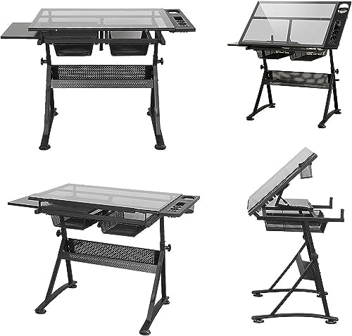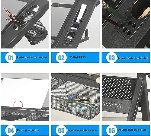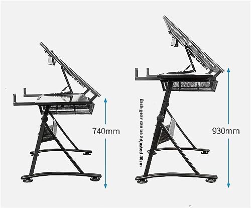 Feature: 1. The large table surface and an additional table surface offer plenty of space for you to plan out projects or lay out your drawing tools. 2. A pencil ledge slides up and locks into place if you'd rather keep pens, pencils, or brushes on the table top. 3. The main workstation can be adjusted up according to your comfort need. 4. Two Iron mesh drawers, offering adequate storing space Specifications: Material:P2 + 6mm tempered glass + PVC + iron Desktop size: (85-98)x81x(74-93)cm(LxWxH) Packing size: 96x 67x 14.5cm Product weight: 28kg Package weight: 29.5kg Adjustable height:6 height Tilted drafting table : 0 to 80° Package Included: 1 x Drafting Table Please contact customer service if you have any questions