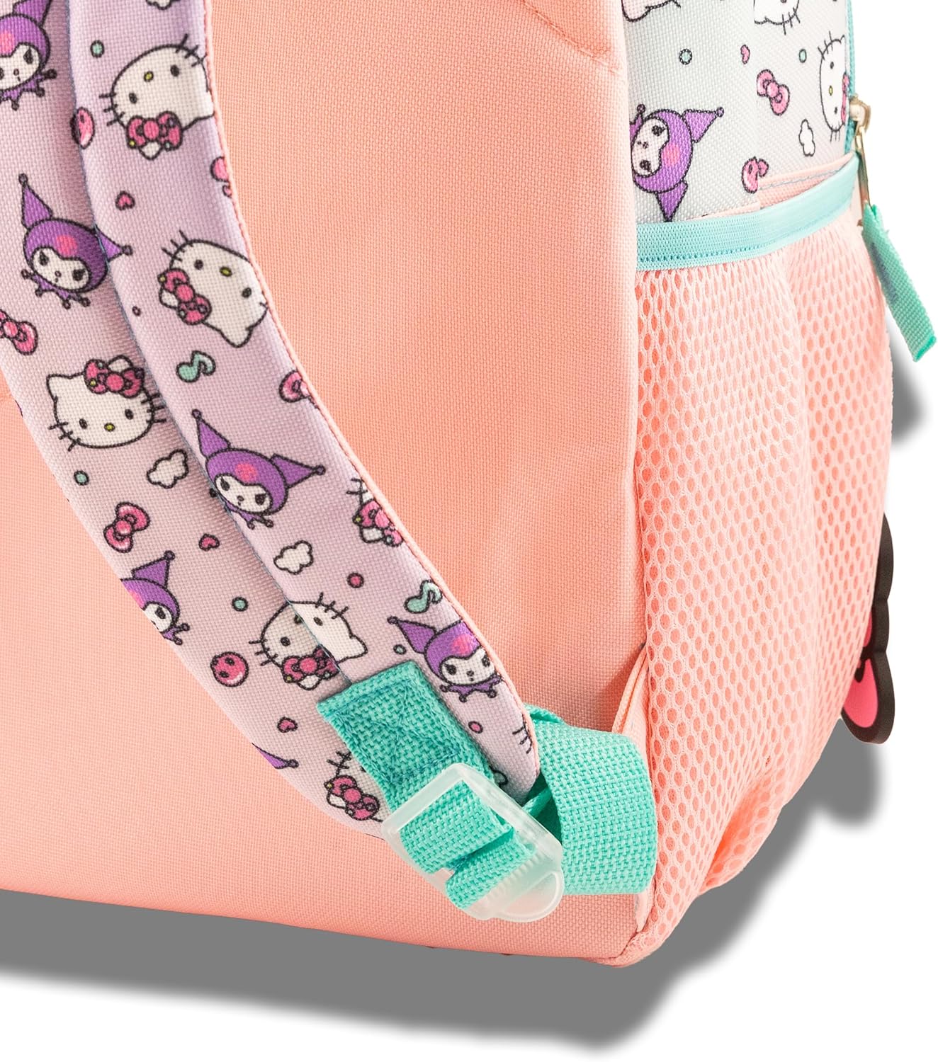 This Hello Kitty and Kuromi backpack set features officially licensed Sanrio artwork with a bold, playful design that brings both characters together in one eye-catching look. The shimmering sequin front panel adds dimension and visual interest while keeping the backpack lightweight and easy to carry. The 3-piece set includes a spacious backpack, an insulated lunch bag with a padded handle, and a matching character accessory. The backpack offers a roomy main compartment and front zip pocket, while foam padding throughout helps provide comfort and structure during use. Finished with padded shoulder straps, durable construction, and fun character details, this Hello Kitty and Kuromi set delivers both style and practicality. Suitable for ages 3 and up, it’s a giftable and versatile choice for Sanrio fans.