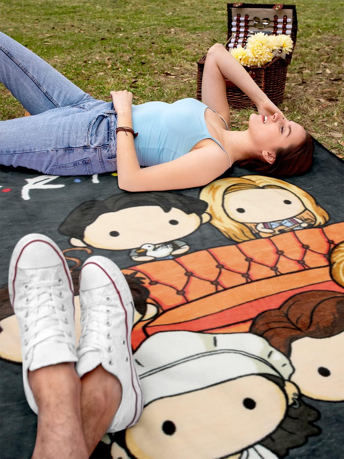 If youâre looking for Friends tv show merchandise, youâve come to the right place! Here you will find officially licensed apparel, home and kitchen goods, and other cool geek merchandise. Friends TV Show revolves around six adults who are roommates and neighbors in New York City. The sitcom follows Monica, Phoebe, Rachel, Ross, Chandler, and Joey in day-to-day relatable situations. This throw blanket features a large design of all the characters from the show in chibi form, and it included the famous orange Central Perk coffee shop couch. The micro raschel feel is much softer than your average fleece throw, and it's perfect for snuggling! It is made of 100% polyester and measures approximately 46" W X 60"L. If you are a FRIENDS tv show fan, then this blanket is for you!