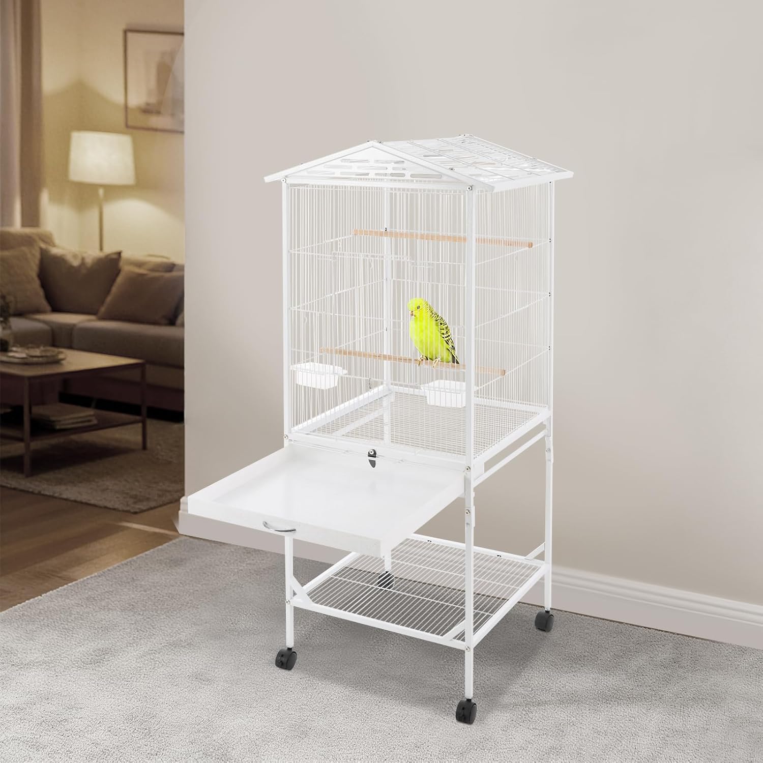 DescriptionThis bird cage is designed to be fashionable and practical, equipped with universal wheels for easy and flexible movement, and can easily adapt to various spaces such as living rooms and balconies. The parakeet cage comes with a bottom storage tier that can hold pet supplies or small items, neat, orderly, and space-saving. Its sturdy and well-made metal structure ensures long-term use, making it an ideal helper for bird-raising families.DetailsConvenient Front Door: It is easy to open and close, making it convenient for your birds to enter and exit.Wooden Stands: They come with smooth surfaces and suitable diameters, making it easy for birds to stand and providing a comfortable resting place for them.ApplicationThis bird cage stand can be used in homes, living rooms, balconies, pet shops, and more. The bird cage stand is suitable for various types of birds, such as budgerigars, parakeets, parrots, cockatiels, and lovebirds.SpecificationColor: Black/WhiteStyle: ModernMaterial: Iron, WoodProcess: Electrostatic SprayingAssembly Required: Yes Installation Type: Floor StandingNumber of Wheels: 4(2 with Brakes)Number of Wooden Stands: 3Cage Wire Spacing: 1cm/0.39inCage Wire Thickness: 1.5mm/0.06inProduct Size: 46*46*125cm/18.11*18.11*49.21inProduct Total Height(with Open Top): 136cm/53.54inEach Package Size: 75*48*9cm/29.53*18.9*3.54inEach Gross Weight: 8.3kg/18.3 lbsEach Net Weight: 7.5kg/16.53 lbsPackage Included1* Bird Cage4* Wheels3* Wooden Stands2* Feeding Cups1* Slide-out Tray 1* English Assembly InstructionOther Accessories for AssemblyNotes1.Please check the size carefully before ordering.2.Please note that this product does not include the bird toys shown in the picture. 3.Please allow the slight color difference caused by the shooting light and the 1-3 cm error due to manual measurement, and make sure you do not mind before ordering.