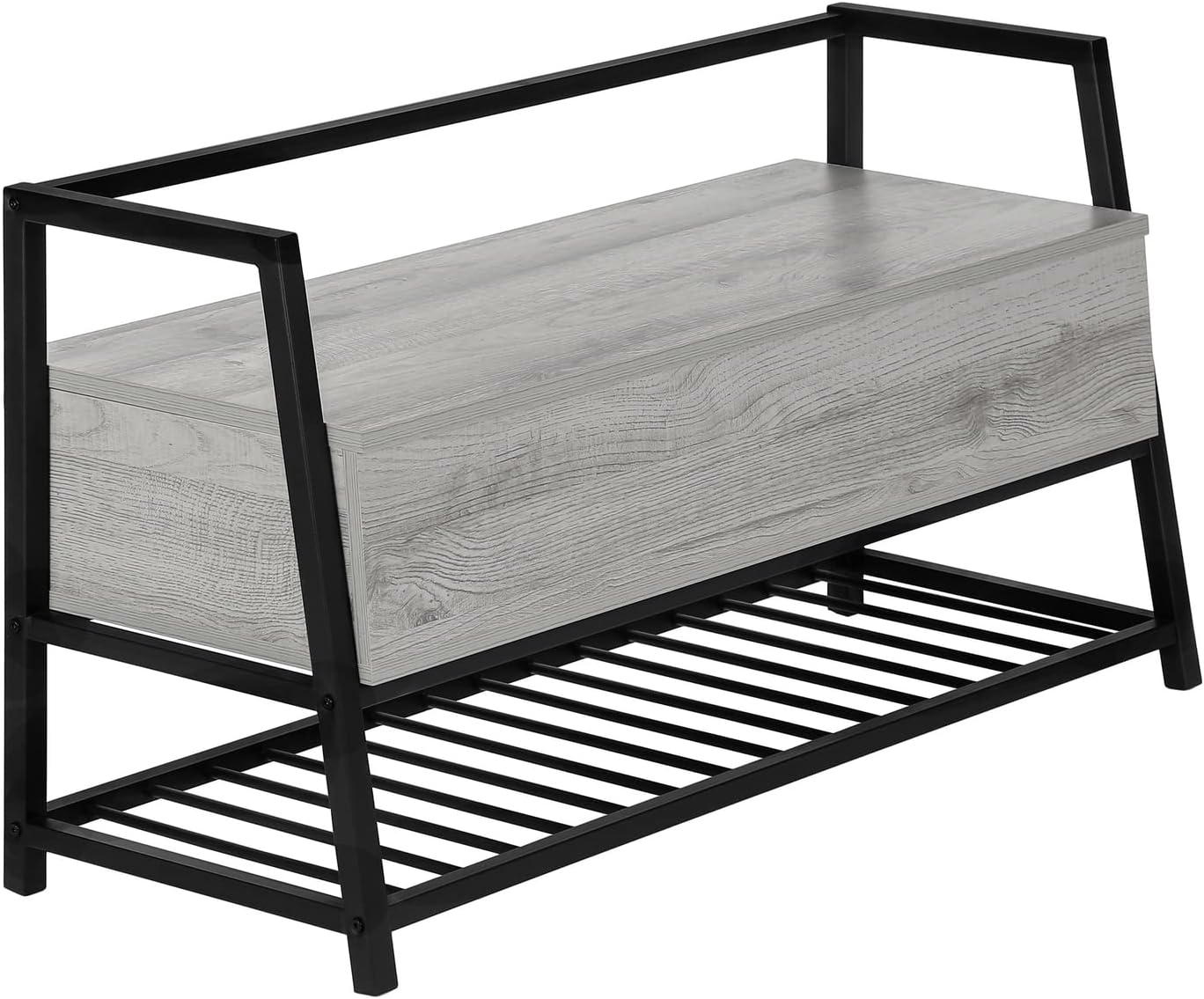Keep your entryway or hallway clutter free with this versatile storage bench. The hinged top lifts to reveal a spacious interior storage cabinet. Under the bench is a shelf for neatly organizing shoes or other items. Conveniently sized and big in functionality, this storage bench in a grey wood-look finish with a black metal frame is brimming with style and substance.
