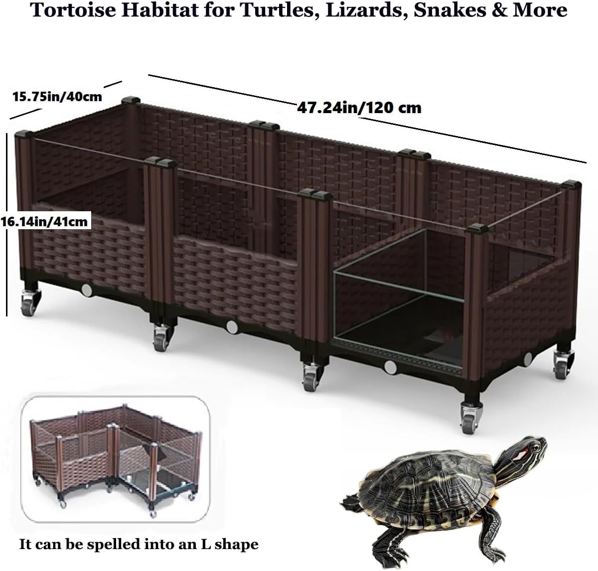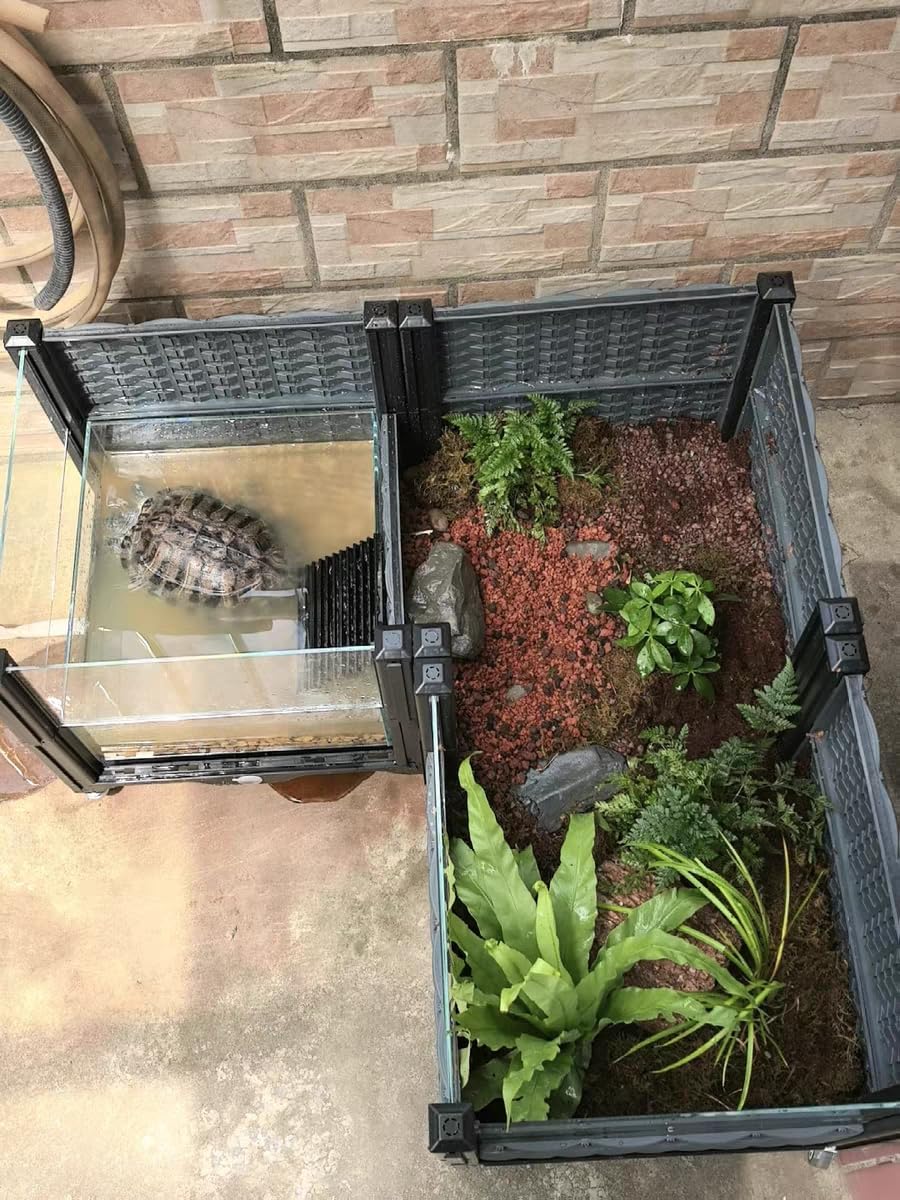Tortoise Shallow Water Turtle Habitat, Home Turtle Breeding Box, Plant Planting Ecological Breeding Box, Drainage & Wheel Material: Plastic + Acrylic + Glass Total weight of the product: 26 pounds Size: 47" x 16" x 16"(L.W.H) Installation method: Please watch the installation video. Features: With drainage function, movable, and for viewing. Extensively used: Give your reptile the perfect home with our ultimate Turtle and Reptile Habitat Enclosure. More than just a tank—it’s a thoughtfully designed ecosystem suitable for aquatic turtles, tortoises, box turtles, lizards, and snakes. Engineered for convenience, this habitat solves common issues of traditional glass aquariums with seamless portability, robust construction, and optimal airflow. Create dry landscapes, semi-aquatic zones, or basking paradises while enjoying crystal-clear visibility and easy maintenance. A secure, movable, and versatile environment that truly supports your pet’s well-being.