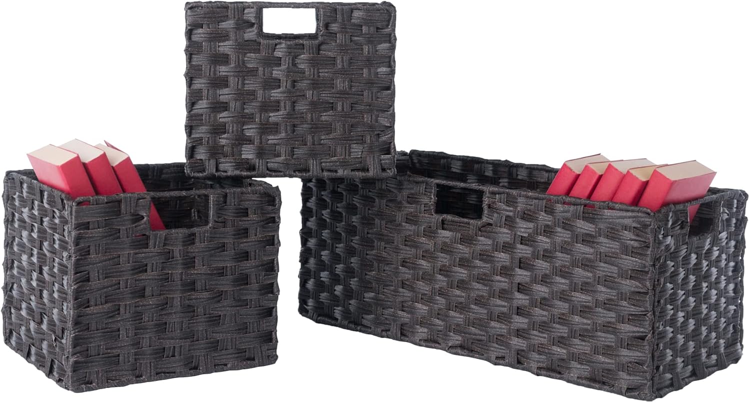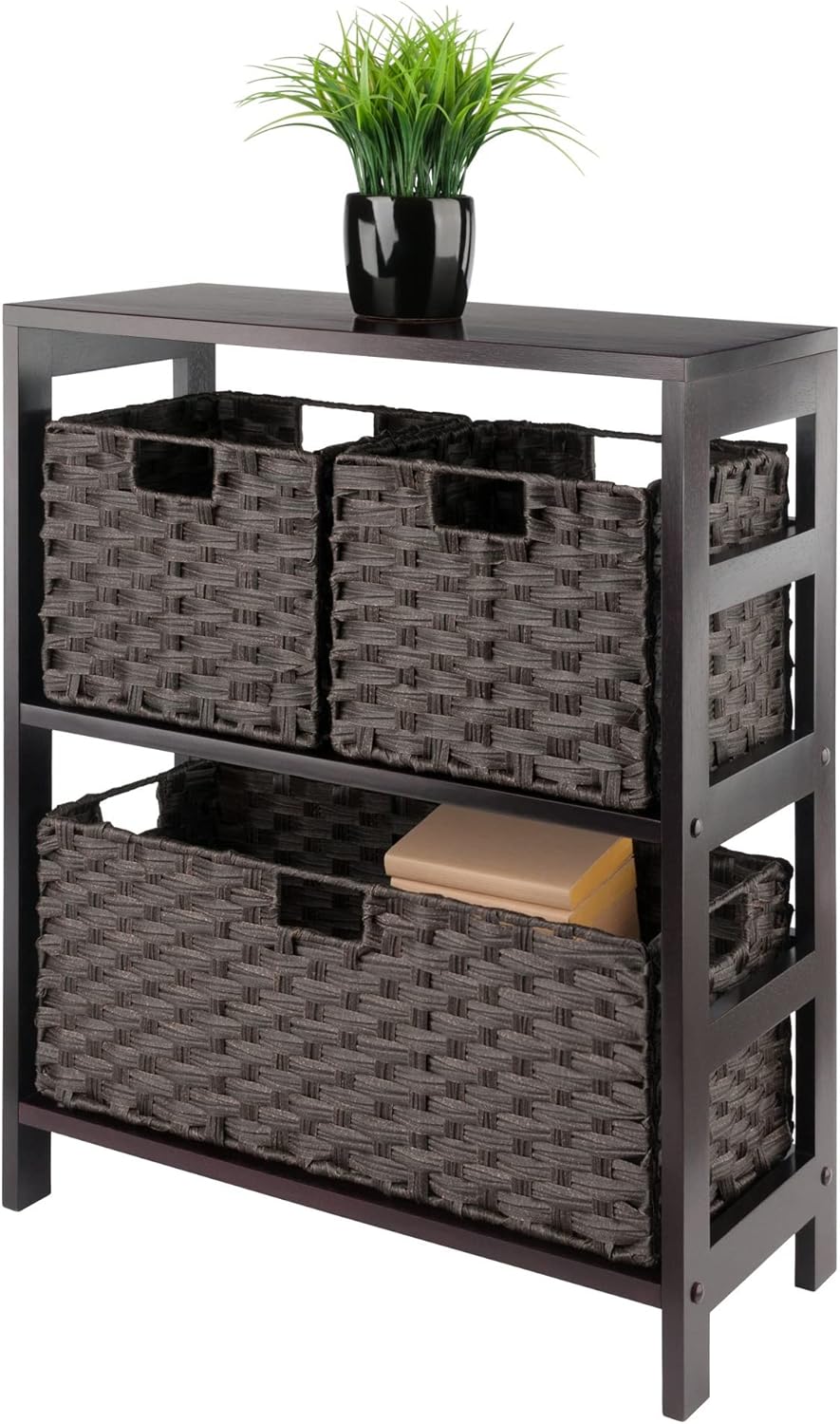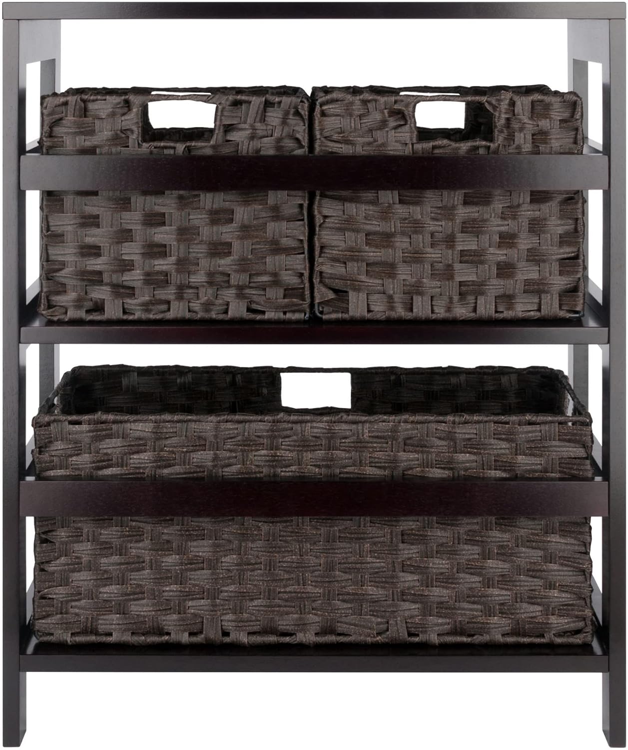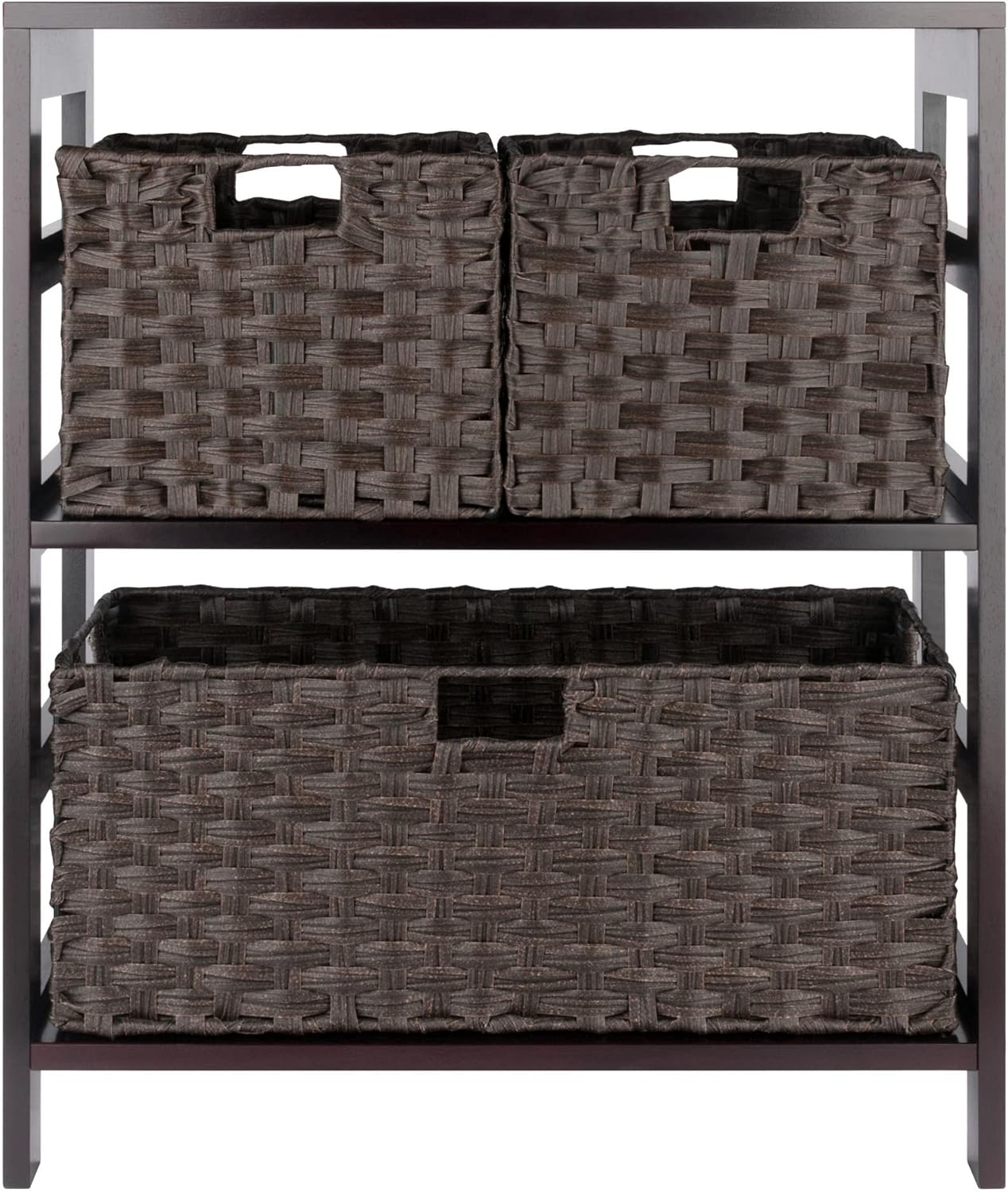 Combine extra storage space with the convenience of the versatile Winsome Wood Leo 4-Piece Storage Shelf. Great organizational shelf that includes 3 baskets, helping keep any room tidy. Keep seasonal accessories handy in the closet, organize toys in the kids’ room, or use as a standalone bookcase in the family or living room. Finished in a rich espresso and made of solid wood for long-lasting durability. The set of baskets are woven in durable flat polypropylene in a chocolate finish and have two cut out handles, one on each end, for carrying purposes. Prompt up and the two small baskets are 10.24”W x 11.02”D x 9.06”H and the wide basket is 22.83”W x 10.24”D x 9.06”H bringing charm and style. They are great for decorative storage and organization and when not in use, they fold for easy storage taking up almost no space. So, whether you need it in the mud room for shoes, laundry room for the towels and detergents, or for your books in your home office, this 2-tier shelf offers stylish organization for all your essentials. This set is shipped in two boxes. The bench will ship separately and will include the hardware necessary for assembly. Replacement parts can be requested directly to the manufacturer within 60 days from date of purchase.
